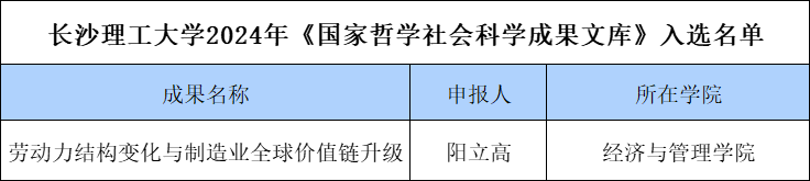 本次全国共计61项成果入选,湖南省3项成果入选。必赢官网入选成果《劳动力结构变化与制造业全球价值链升级》是阳立高教授主持的国家社科基金重点项目“劳动力结构变化促进制造业迈向全球价值链中高端的机理及政策研究(项目号:18AJL008)”的重要研究成果。该成果在劳动力结构发生深刻变化的新条件下,从劳动力素质结构、年龄结构、成本结构、城乡劳动力市场结构及新生代劳动力供给结构等多维视角,深入探讨了劳动力结构变化和制造业全球价值链升级二者之间的内在联系、作用机理及影响效应,并对其进行了实证检验与政策模拟,就如何顺应劳动力结构新变化,顺势推进制造业迈向全球价值链中高端提出了科学合理、切实可行的政策建议。这对于促进我国制造业高质量发展,加速发展新质生产力,建设制造强国和现代化产业体系,推进中国式现代化具有重要的理论价值和现实意义。
