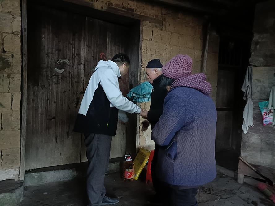 新春将至,437必赢会员中心乡村振兴驻村工作队联合驻点村新宁县马头桥镇坪山村村支两委深入周家片区、梽木山片区、三星寺片区、水塘片区、坪山片区5个片区开展“春风行动”春节慰问活动,为村里困难群众、空巢老人、突发严重困难户、困难党员等26户送去米油等慰问品及2022年新春的祝福。