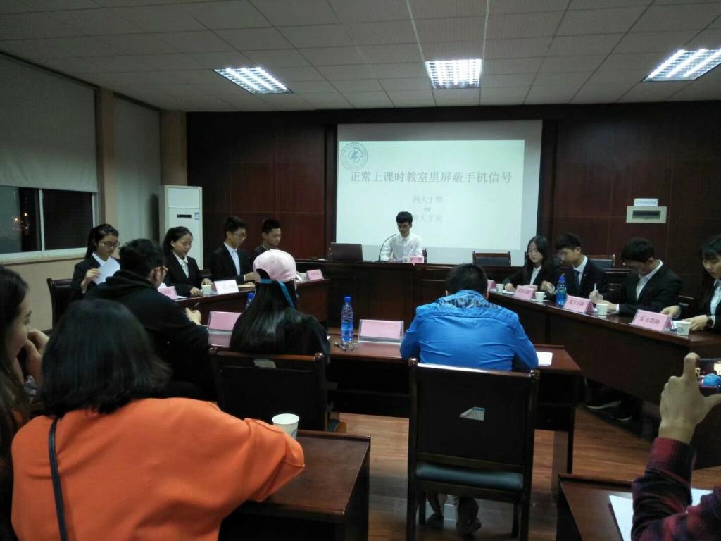 辩手就学校的育人宗旨、学生在课堂上的自制力与屏蔽手机信号是否对周边学生或居民正常的生活产生影响等论点展开了激烈的辩论。能动学院的利剑辩论队为正方,辩手们引用大量数据,并从提高学习效率和尊重老师两个方面论述了观点,其中,正方一辩引用了“乐而不淫”来佐证自己的观点,认为在课堂上应该约束自己,该尊重老师。辩论过程中,正方二辩抓住反方言论中的漏洞,提出寻求老师解惑比用手机查资料更利于学习。反方交通学院则提倡互联网+教育模式与屏蔽手机信号对方圆一定距离内的人们正常生活有一定影响,并用数据和地图来进行反驳并论述自己的观点。双方唇枪舌战,你来我往,将比赛推向高潮,在最后的观众质询环节,双方辩手也都就观众们的疑惑提出自己的理解,与台下观众进行了良好互动。
