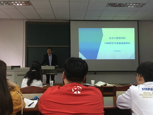 3月28日下午,经管学院在金盆岭校区7-110举行14级分专业就业座谈会。下午2:30,为14级金融专业就业座谈会。学院党委副书记涂道勇、金融系主任尹筑嘉参加,会议由院就业专干计潇主持。