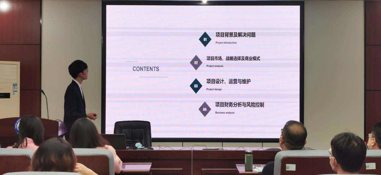 本次答辩会积极落实疫情防控要求,分为线上线下两个板块进行。其中共有十六个团队参与线下答辩,四个团队参与线上答辩。答辩由团队主答辩人通过PPT展示进行项目讲解,每五组答辩结束后,由评委老师进行点评。各团队通过项目介绍,项目背景,整体效益几个方面,多维度的展示了独特的创业想法和各具特色的创业方案。评委老师们对各团队的答辩给予了肯定,同时也针对各团队的汇报内容给出专业的建议,详细指出了项目的不足之处,杨建军在最后总结中指出,希望同学们聚焦社会热点,解决实际问题,更加深入到实践一线探寻创业的真谛。