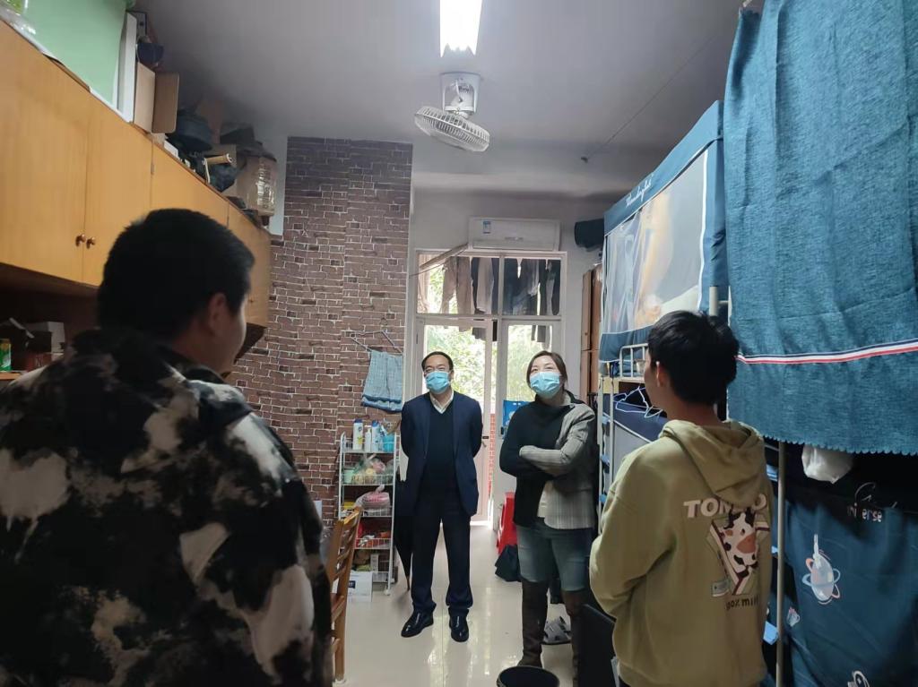党委书记丁丹、副书记唐青、副院长阳立高、辅导员戴逢哲一行来到弘毅轩三栋男生宿舍,和学生亲切交流,讲解疫情防控政策,了解学生学习生活困惑。唐青、何涛召开学生干部会议,收集疫情防控学生管理中的问题。