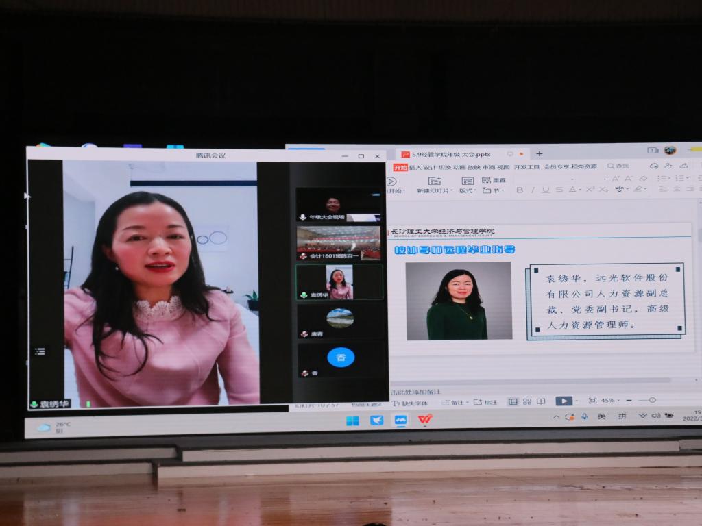 本次年级大会还邀请到两位校外导师进行毕业教育。远光软件股份有限公司副总裁袁绣华针对毕业生角色转换,分享了场必备技能和锦囊妙计。2007届毕业生、四川路桥总部人力资源部副部长黄炉香谈到自己对工作的看法时,她说:“能力是重要的,但踏实与坚持更为重要”。
