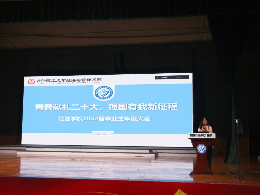 5月9日下午,经管学院在云塘校区大会堂召开“青春献礼二十大,强国有我新征程”2022届毕业生年级大会。参加会议的有经管学院党委副书记唐青、院副院长王治、教务办廖妮娅、毕业生辅导员何涛、叶鑫,以及2022届全体毕业生。会议由毕业生辅导员叶鑫主持。