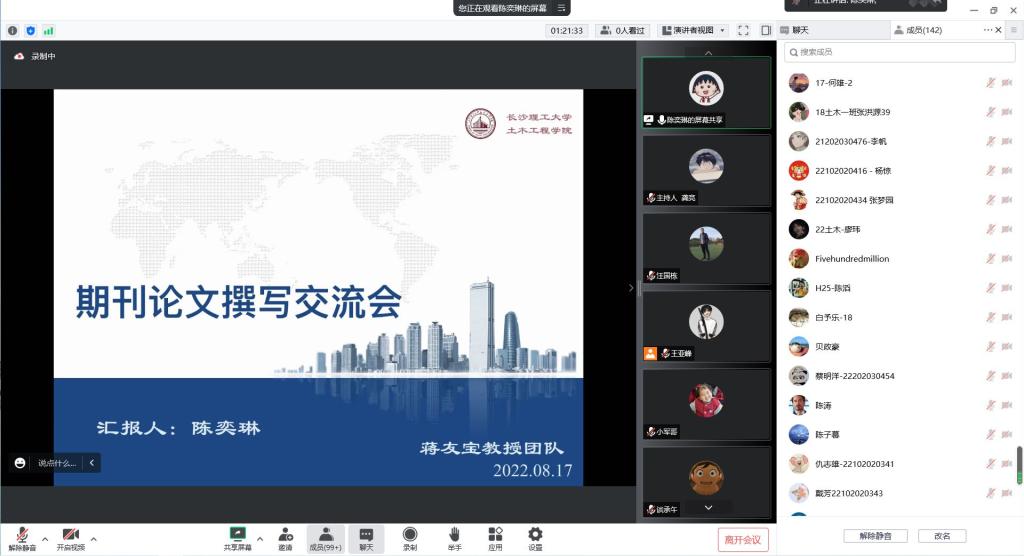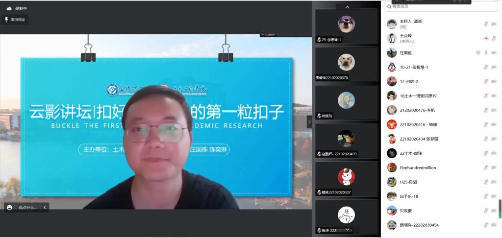 为做好2022级研究生入学教育,以更加饱满的学术热情迎接研究生生活的到来,8月17日,土木工程学院举办云影讲坛线上讲座,主题为“扣好学术研究的第一粒扣子”。2017级博士汪国栋、2020级硕士陈奕琳应邀主讲,研究生辅导员李小军老师及2021级、2022级研究生150余人参加活动。