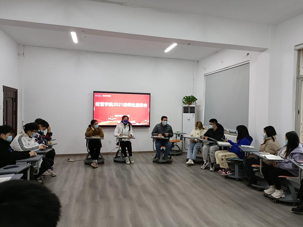 12月1日下午,经管学院在金盆岭校区办公大楼101室召开2021级师生座谈会,院党委副书记唐青,21级辅导员王宝宝、杨舒文及学生代表参加。