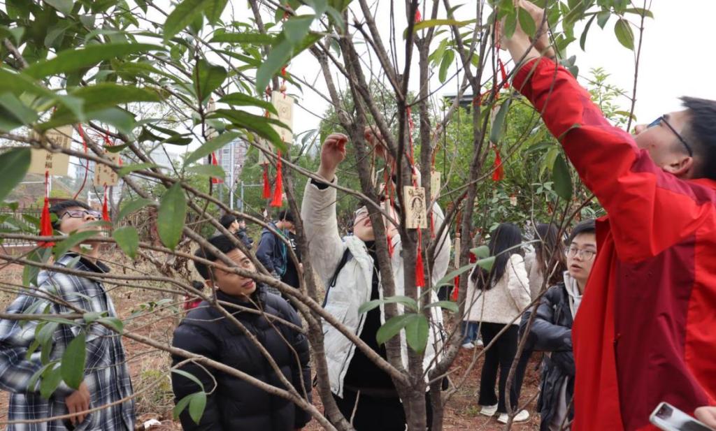 “一战成硕,这次我一定成功”:这是一名考研学子在福牌上写下的考研心愿。在化学化工学院劳动育人实践基地上,考研学子在福牌上写上心愿,并将其挂在由学院老师亲自种植的桂花树上,寓意深刻。化学学院院领导及各毕业班班主任老师皆佩戴红色围巾,为全体考研学子发放考研助力礼袋,袋内含印有祝福语的保温杯、有手绘“考研上岸”等字样的明信片、糖果及学院领导老师亲手缝制、寓意“高中”的粽子福袋,让考研学子倍感温暖,倍受鼓舞。