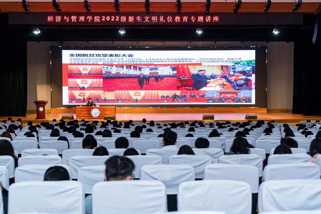 3月23日晚,经管学院在金盆岭校区5教大礼堂举办以“做文明守礼的大学生”为主题的2022级新生文明礼仪教育专题讲座,讲座由副校长蒋璟萍主讲。副院长彭新宇主持讲座,院党委书记丁丹、副书记唐青、学工辅导员及1000余名22级本、研学生到场学习。