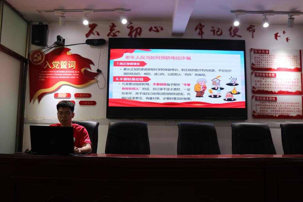 同时,实践团还为老年人开展了防诈骗知识宣传,为他们细心讲解老年反诈知识,提醒老年人不要随意向陌生人透露个人信息、银行卡密码等,守好自己的“钱袋子”,谨慎上网,绕过骗局。同时,队员们的细心也如流水一般陪伴并温暖着老人们的心,让他们感受到了善意拂过的暖风,熟悉了诈骗天坑的套路。
