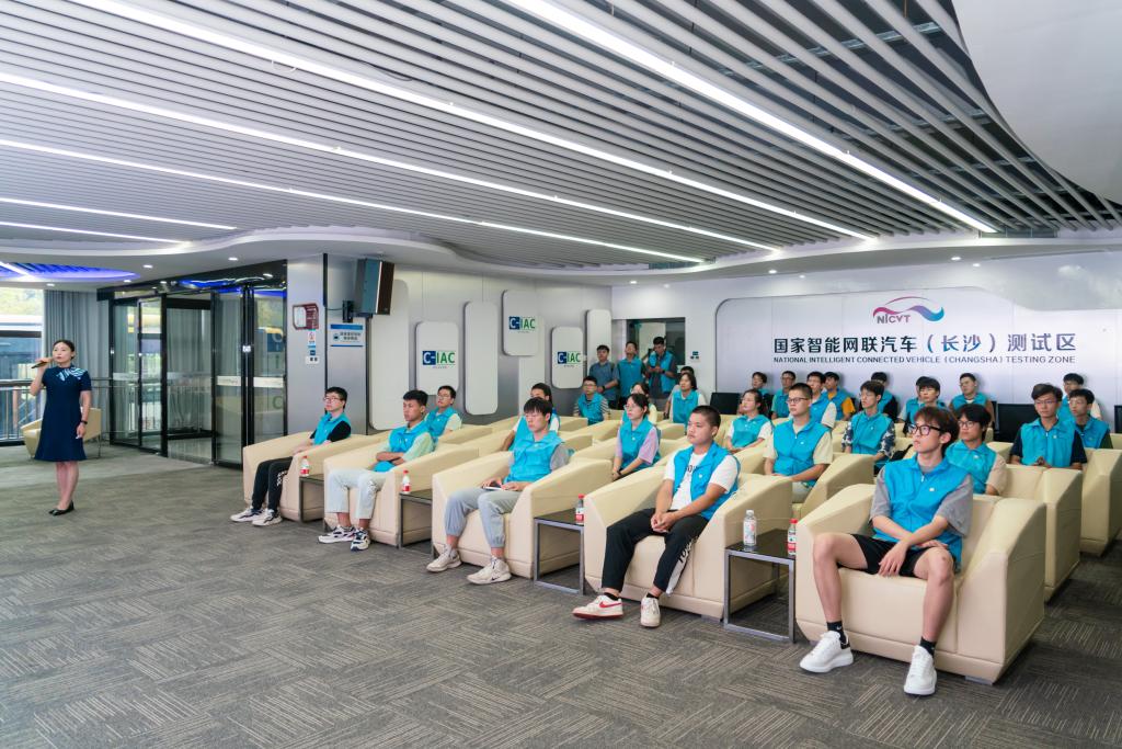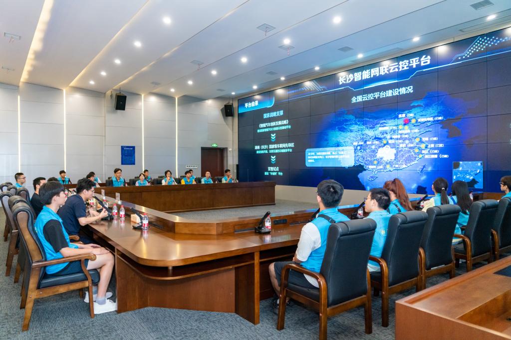 随后,同学们来到湘江智能网联产业园孵化器二楼云控平台,湘江智能负责人向学生们讲述企业在智能网联领域的应用成绩——技术版图在全国范围内铺设的越来越广,信息服务在商用出行、停车、公交等生活场景中应用的越来越深入,智能网联的未来也在产业链的发展过程中越来越清晰。