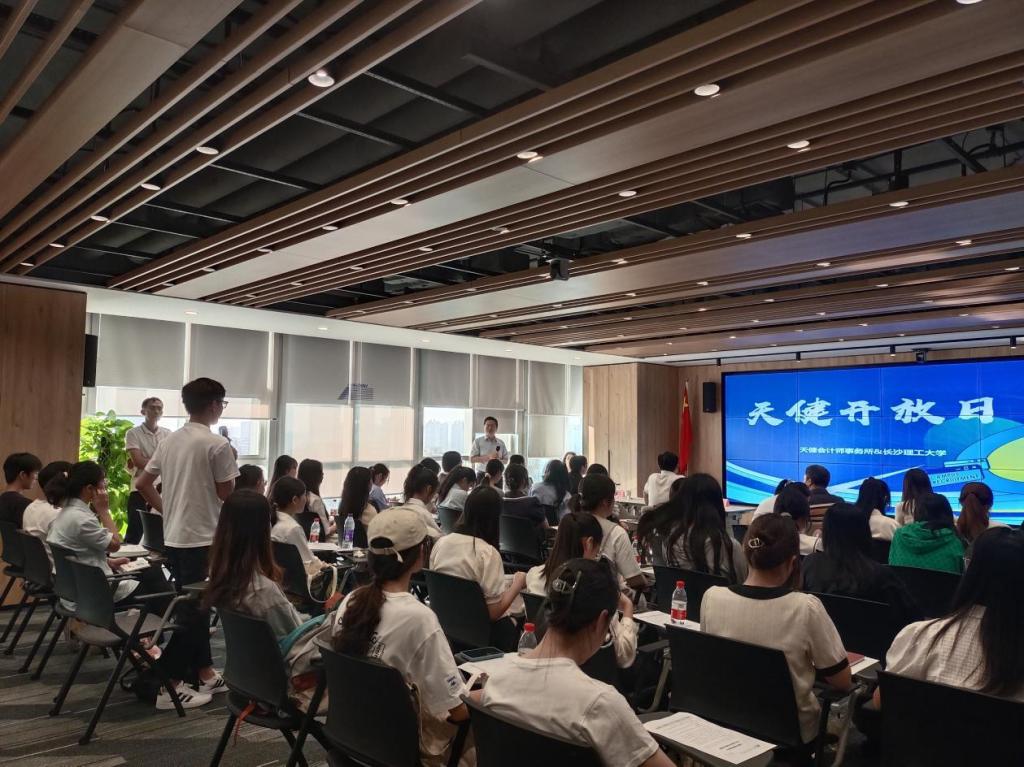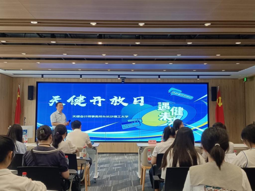 活动首先由伍超带领学生参观了位于市中心交银大厦的天健事务所工作区域,让同学们感受到公司拥有良好的工作环境与氛围。随后来到了多功能会议厅召开会议。首先师生们共同观看了天健宣传片《手可摘星辰》以及行业宣传片《湖湘注会行业青年说》,对天健会计师事务所和注册会计师有了初步的认识。接着,李剑向同学们介绍了天健会计师事务所基本情况、湖南分所基本情况以及天健文化与发展观。他表示,校企合作是学校和用人单位的互利互赢,能够培养出更多的社会栋梁之才。随后,长理优秀校友代表李旭东、樊梦萍回忆了自己的大学时光,感恩学校与学院对自己的培养,并讲述了自己毕业后的成长与经历,她们表示,在天健会计师事务所建立了自己的工作自信与工作体系,并祝福437必赢会员中心与天健会计师事务所都能够更上一层楼。校友分享后,赵娇进行了“注册会计师审计——过去现在与未来”的主题分享,她从职业起源、行业现状、对未来的思考这三个方面为经管学子上了丰富且生动的一课。她表示,随着科技的发展,行业更加需要有大数据思维与数字化技能的人才,学生要注重提升自己的数字技能,迎合行业用人的需求。