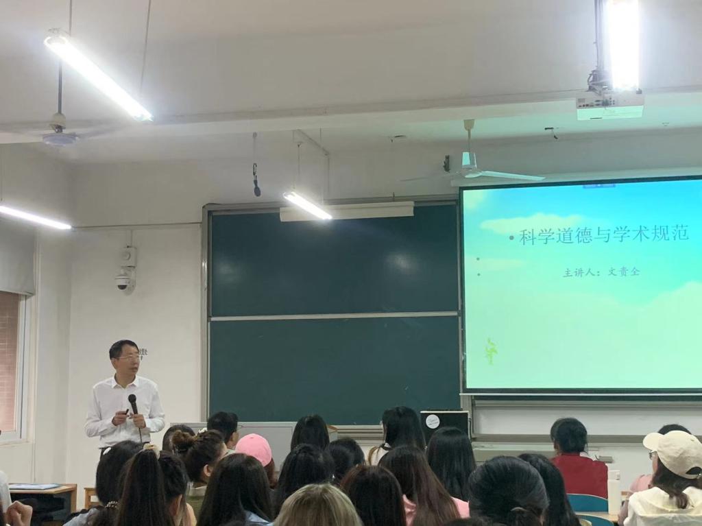 为使同学们增强科研道德意识,严格遵守学术规范。9月21日上午9:00,马克思主义学院在文科楼B303开展“科学道德与学术规范”专题讲座。本次课程由马克思主义学院副教授文贵全主讲,辅导员老师曾蓓主持,2023级全体研究生参加。