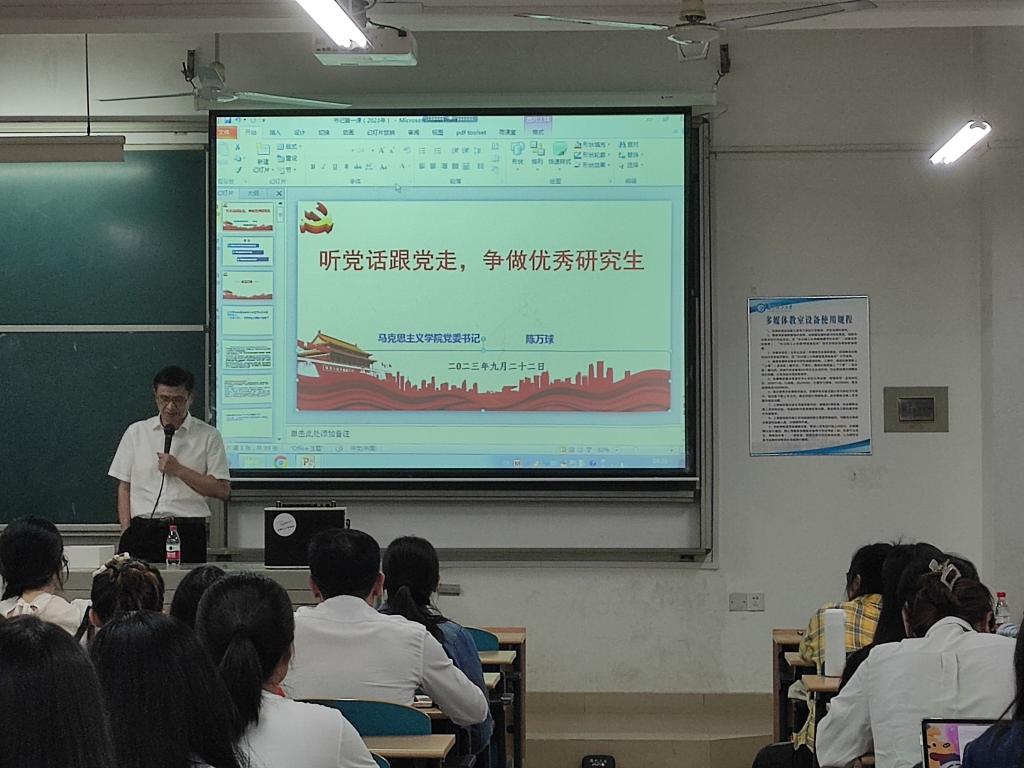 9月22日下午,马克思主义学院在文科楼B303开展书记第一堂党课。院党委书记陈万球主讲,2023级全体研究生参加。