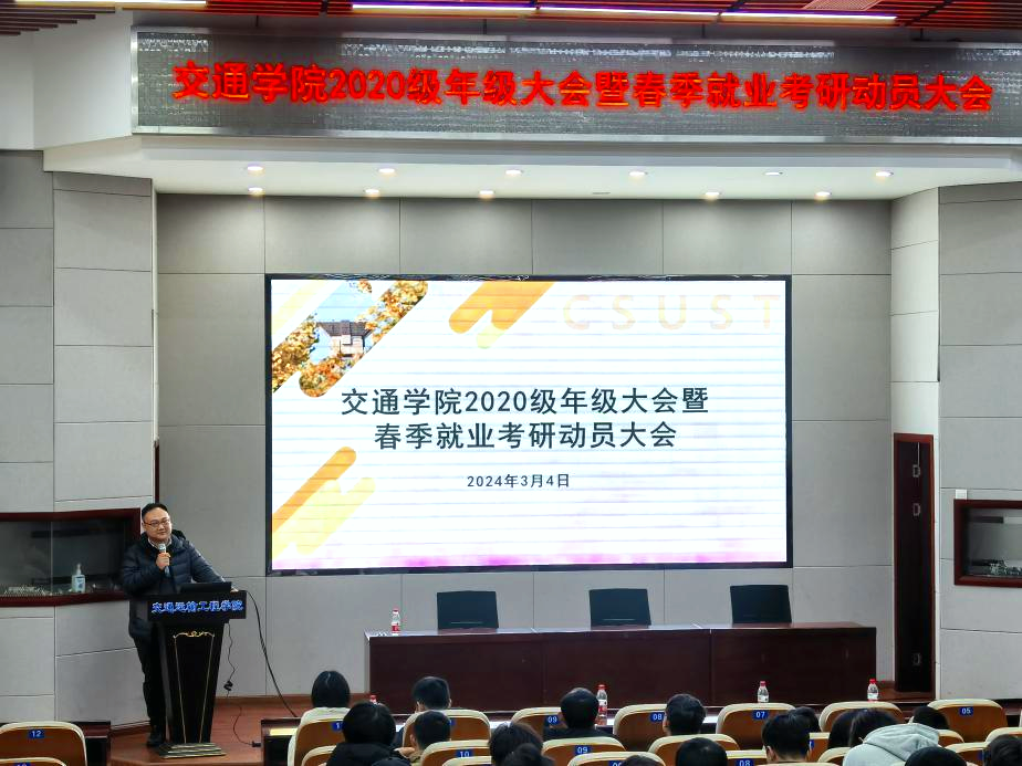 为推动2024届毕业生高质量就业,交通学院于3月4日下午在云塘校区工科二号楼B-301召开2020级年级大会暨春季就业考研动员大会,交通学院党委副书记、副院长任志祥、研究生培养办刘文琳老师、学工办辅导员李特超老师和冯心崚老师以及全体毕业生参与本次会议。