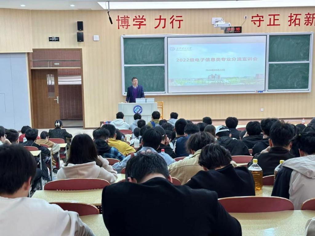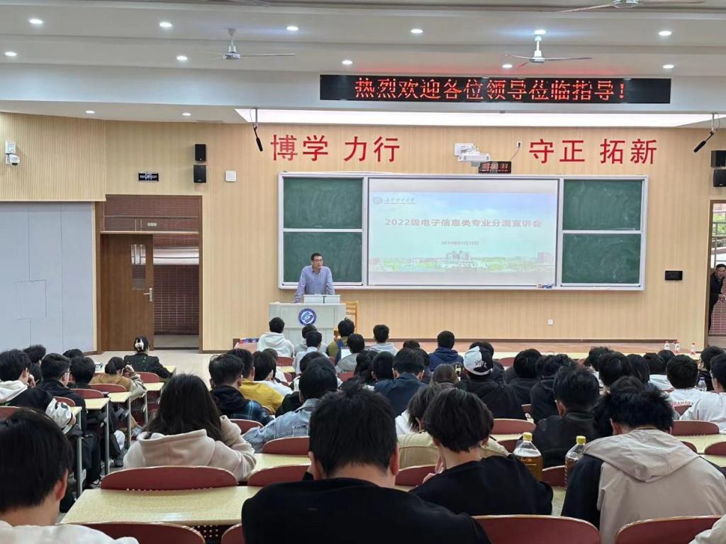 宣讲会上,张院长做了专业分流动员讲话,介绍了我院电子信息类大类招生与培养基本背景,通过典型案例介绍了专业与个人发展的关系,引导同学们调整心态,根据自己的志趣理性选择专业,为实现专业梦想而努力。