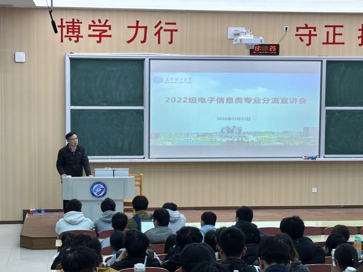 3月22日下午,物电学院2022级电子信息类专业分流宣讲会在综教B102和B202教室举行。学院副院长张卫兵(主持工作)、副院长范志强、电子信息系老师文勇军、商雄军、唐俊龙以及2022级辅导员马凯文出席参与了此次活动,会议由学院党委副书记宋国宁主持。