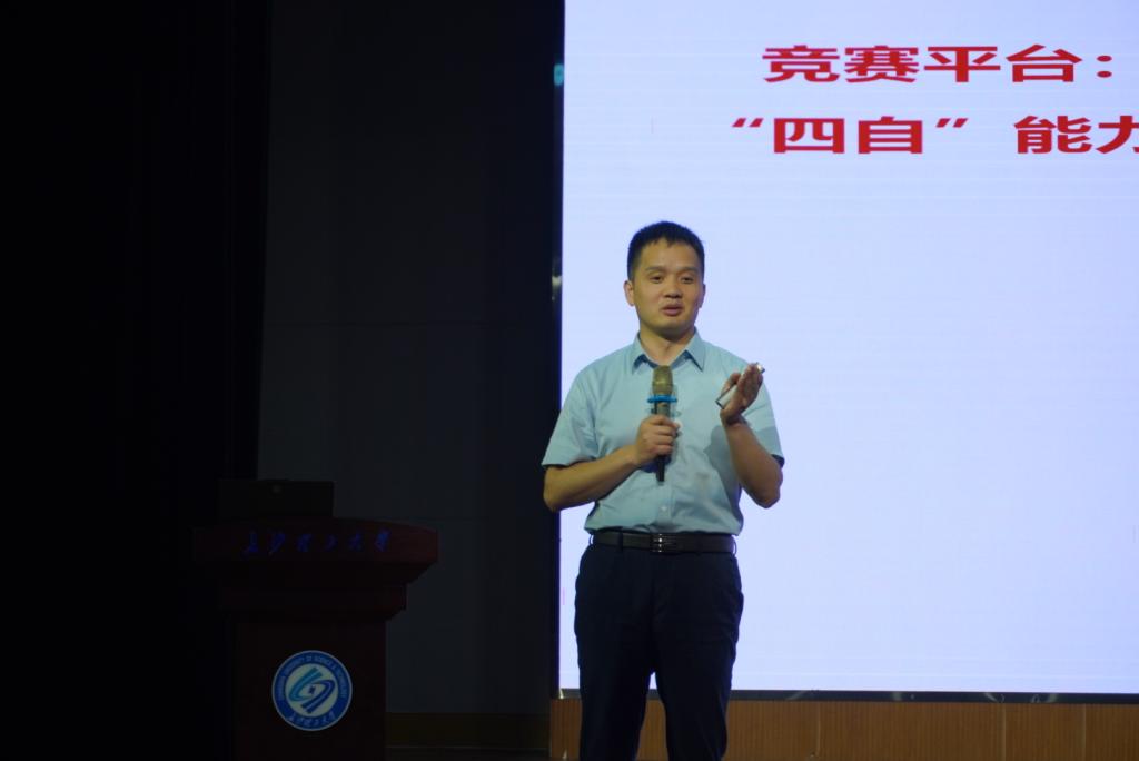 付果的宣讲主题为《科创育人——土木大类学科竞赛》,他从我国高等教育教学背景引入,指出培养“底色亮、实践强、善创新、敢担当”的高素质创新型人才是学校的时代使命和责任担当,付果向同学们介绍了学院近年来对科创中心的持续建设,对实践模式的不断创新,以及逐年扩大的实训项目与实训学生数,并详细介绍了类型齐全、权责清晰、分工明确的科创育人场地;“四自”能力、“四团十组”“CDI0 工程教育模式”等教学模式、项目驱动、知行合一、以赛促学、朋辈传承的科创育人过程;成绩斐然、成果卓越的科创育人成效。他强调,实践出真知,教是最好的学,向同学们展示了土木大类学科竞赛的目录清单并介绍了学院开展的双创训练营,鼓励同学们要积极参与科创竞赛,提高动手能力及实践能力,成为具有创新精神和实践能力的新时代高素质创新型人才,为我国科教兴国、人才强国、创新驱动发展战略建设增一分热、发一分光。