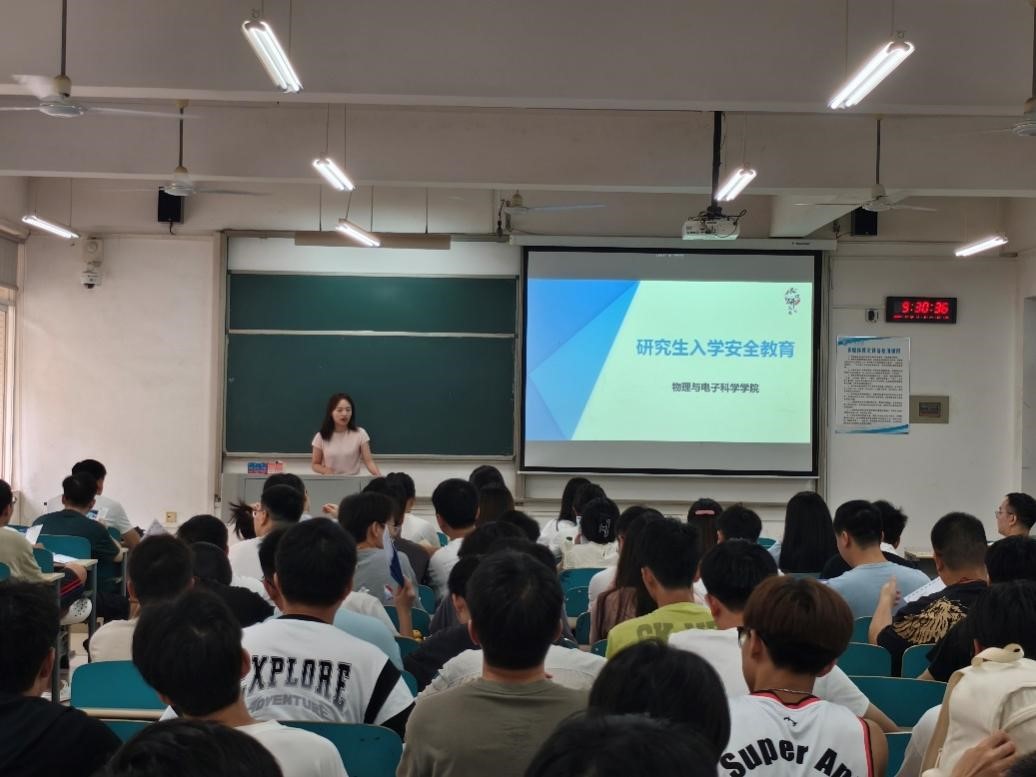 9月13日上午,物电学院2024级研究生入学安全教育在文科楼E201举行。本次会议由研究生辅导员蒋琳嫒主持,24级全体研究生参加。