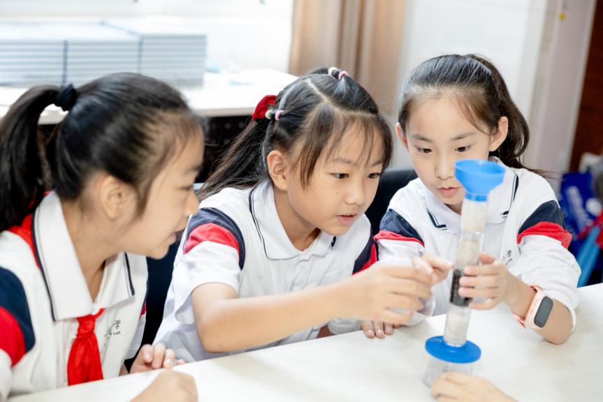 “我给大家变个魔法,让污水变成干净的水好不好?”在科普实验环节中,志愿者们带领同学们制作了简易的净水装置,被污染的水依次通过塑料试管中的花岗岩石子、瓷石、活性炭变清澈,同学们在感受到了实验的乐趣的同时学习了水净化的过程。而科学小实验“彩虹泡泡龙”则带领同学们学习了水表面的张力作用。