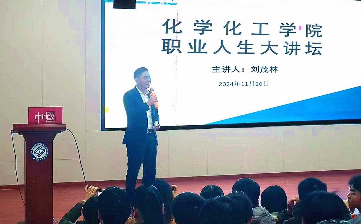 为深入推进学生对化学未来就业及专业未来发展趋势的了解,11月26日,化学化工学院在云塘校区文科楼A100报告厅举办职业人生大讲坛,湖南丽臣实业股份有限公司董事长刘茂林受邀主讲。