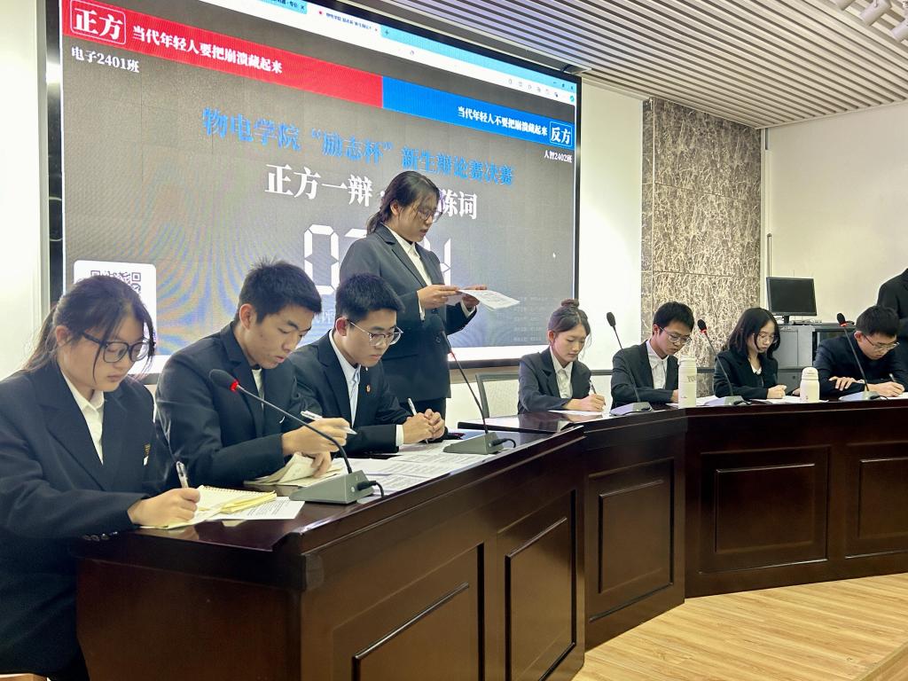 12月6日晚,物电学院在云塘校区理科楼B413教室举行以“当代年轻人要/不要把崩溃藏起来”为主题的辩论赛决赛。本次赛事由常玉祺主持,辅导员郭晨鑫出席此次赛事,物电学院辩论队成员易邦、唐慧雯、郑甲申担任评委。本次辩论赛的正方班级为电子2401班,反方班级为人智2402班。