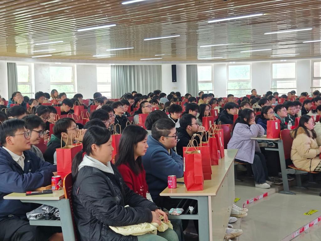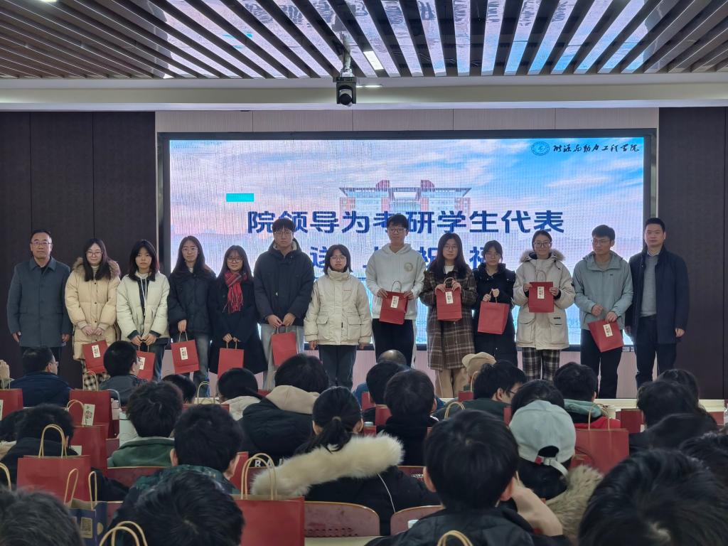 会上,王明彦、李传常代表学院将“金榜题名”大礼包赠予学生代表,并送上深深祝福。每一件大礼包上皆标注了即将参加考试学生的名字,还装有保暖贴、明信片、小零食等物品,以及寓意着考“柿”顺利、一举夺“葵”的小饰品。彭卓寅鼓励全体考生冲刺阶段要坚定信念,学院是大家最坚实的后盾。罗亦欧提醒全体学生考试注意事项,开展诚信应考教育,并表示期待在开春之际能收获所有考生的好消息。