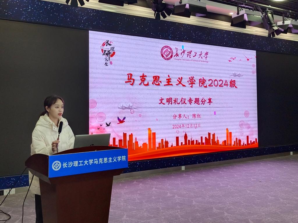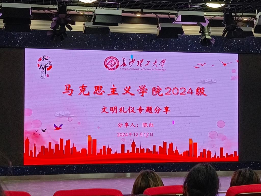 12月12日下午,马克思主义学院在云塘校区文科楼B300报告厅开展文明礼仪专题讲座。此次讲座采取分享会的形式,由2024级研究生班班长陈红主讲,院学工办主任曾蓓主持活动,2024级全体研究生参加。