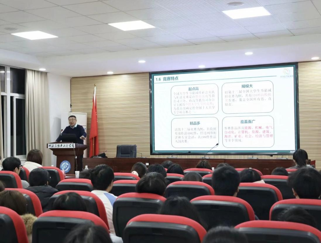 赵斌教授以《节能减排竞赛历程、评审要点及获奖作品解析》为主题,围绕竞赛发起、竞赛特点、组织架构以及历届节能减排竞赛国赛及省赛的主办学校、参赛规模、作品要求、评审要素等内容进行详细阐述,加强同学们对节能减排竞赛的了解,激发学生参赛热情。