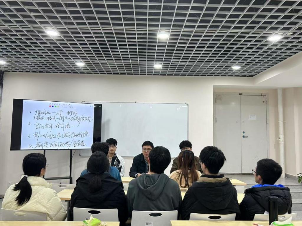 盛舒航对学生干部进行业务工作培训,分别从工作介绍、现场拍摄、推文制作、新闻稿撰写四个方面进行了细致培训。