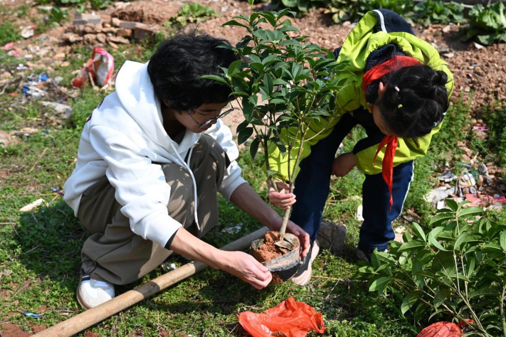 植树现场,10余株树苗被命名为“雷锋纪念树”。孩子们挥动小铁锹,协同完成挖坑、培土、浇水全流程,一起种下绿色的希望,小朋友们对植树的热情和对大自然的热爱也随小树苗悄然生长着。