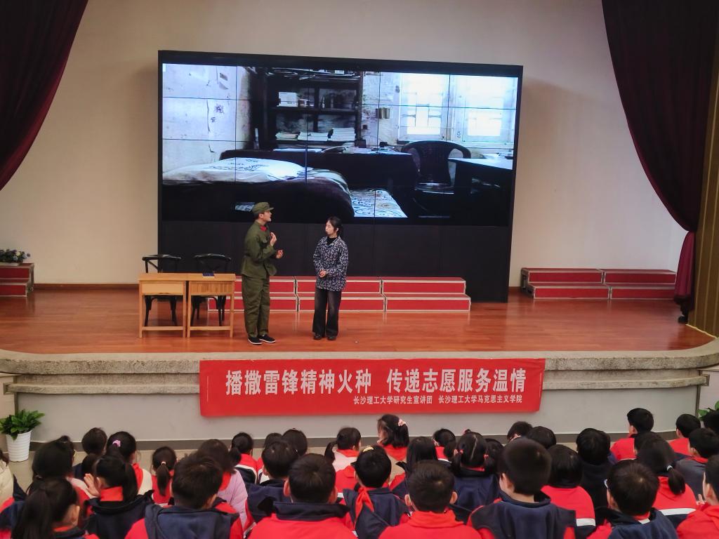“如果你是一滴水,你是否滋润了一寸土地……”情景剧后,在场的一位小学生上台诵读了雷锋日记片段。宣讲团成员以经典语录诵读、互动问答等多种方式,带领小学生们深入了解雷锋生平和成长故事,将“雷锋精神”播种到孩子们的心田里。
