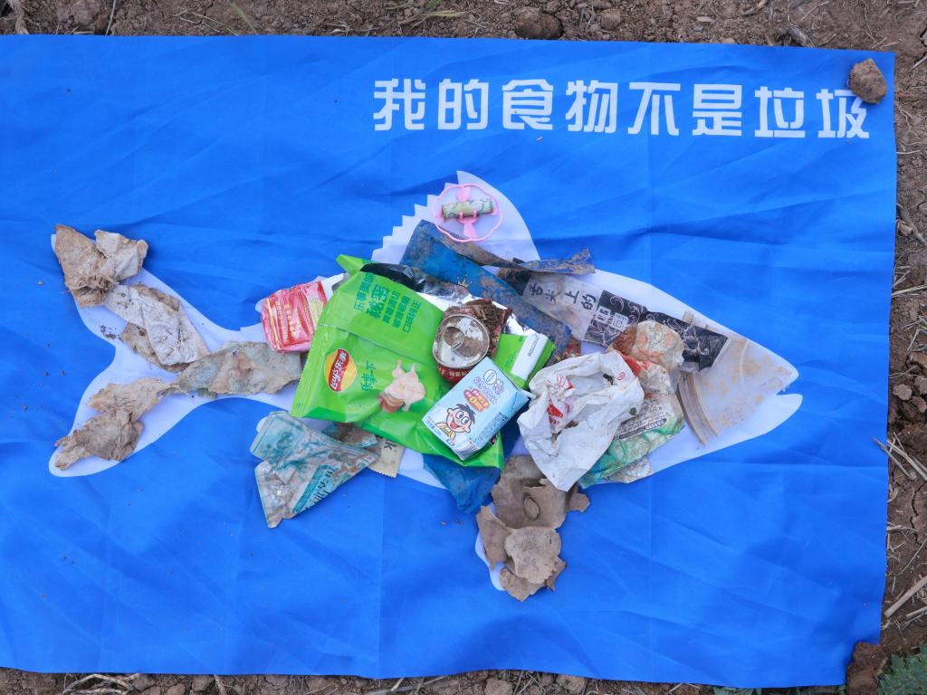 活动伊始,志愿者们手持垃圾袋,沿岸进行地毯式清理。白色垃圾、废弃纸板、细小烟蒂被逐一拾起,志愿者们将收集的“垃圾图鉴”拼贴在一幅巨型画布上,堆砌成鲸鱼身躯,“我的食物不是垃圾”的醒目标语直观展现环保工作的紧迫性。