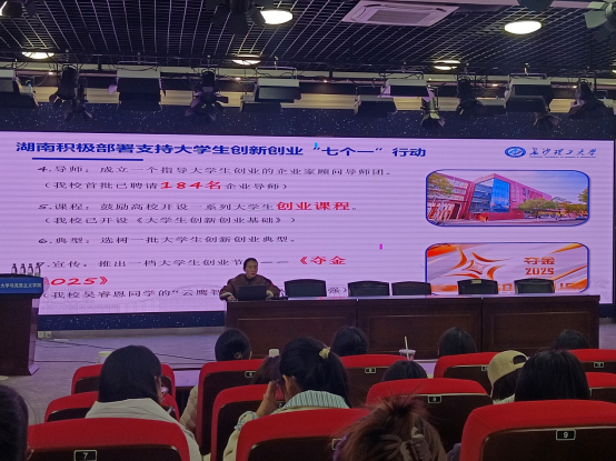 曾蓓强调学生综合素质培养的重要性,鼓励同学们踊跃参与形式多样的课外活动,在实践中促进个人全面发展。针对创新创业,她从政策扶持、基金助力、孵化培育、导师指导、课程体系、典型引领和宣传推广七个维度,介绍了湖南省为支持大学生创新创业所开展的系列工作,为同学们描绘出一幅清晰的创新创业政策与服务全景图,助力同学们在未来的创新创业之路上行稳致远。