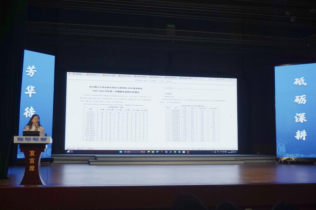 王正博通过翔实的数据,对2024级第一学期学业情况进行全面剖析。她对比年级平均绩点、挂科率、英语四级通过率等指标,指出当前存在的“学习动力分化”“时间规划不足”等问题,并提出建立“一对一帮扶小组”、开展“学霸微课堂”等针对性举措。她强调:“大学学习是一场长跑,唯有脚踏实地,方能厚积薄发。”