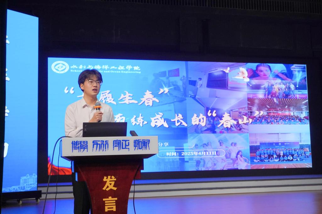 大会特别设置“榜样力量”先进个人分享环节。平均学分绩点3.98的水文特岗2401班肖翊晗从“目标管理”“高效笔记法”“复习节奏”三方面传授学习心得;英语四级632分的地信2401班高浩然,提出“沉浸式学习法”,分享利用碎片时间精听、泛读的实用技巧;水利类2405班何佩澄作为读书活动先进个人分享了纸质阅读带给自身的成长力量,从书中感悟治水哲理,在实践中践行水利精神;给排水2202班王俊超以“步履生春,勇攀历练成长的春山”为题,分享了作为学生干部的信仰与使命,从拓荒山到攀高山再到赴群山,他鼓励新生“在服务他人中实现自我提升”。