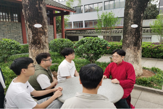 参观结束后,一场充满创意与深意的“穿越时空的对话”活动拉开帷幕。同学们换上长袍,穿梭在草木葱茏、庄严肃穆的旧址之中,仿佛跨时空与先辈们展开了一场心灵对话。大家围绕新民学会的历史意义、五四精神的内涵,以及在新时代如何传承和弘扬五四精神等话题展开热烈讨论。
