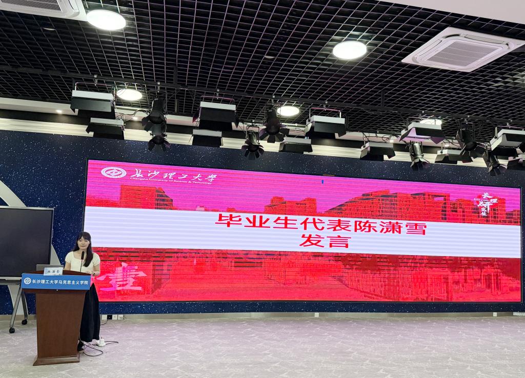 2025届优秀毕业生代表陈潇雪发表毕业感言。她代表全体毕业生向精心培育他们的学院领导、老师表达了衷心的感谢和崇高的敬意,也向陪伴自己求学、成长的同学们表示感谢。她特别提到马克思主义理论中的“螺旋式上升哲理”让她在挫折中学会坚韧、在探索中明晰方向,从青涩学子成长为善于用理论关照现实,推动实践进步的追光者。在即将告别母校之际,她祝愿学院发展蒸蒸日上、再创辉煌,也祝同学们前程似锦,未来可期。