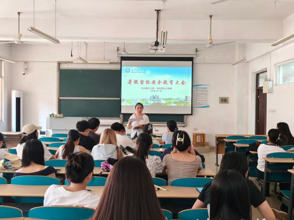 会上,曾蓓围绕规范日常管理和筑牢安全防线两个方面展开。在日常管理方面,她强调信息精准登记、保持电话畅通的重要性,提醒大家遵守请假制度和宿舍管理规定,并对相关费用等事宜进行了说明。在安全防范方面,她强调了消防安全、防溺水安全、防盗安全、防骗安全、外出安全、食品安全等。同时,她提醒同学们关注湖南省24小时心理咨询热线,调节心理状态。最后,曾蓓建议同学们珍惜假期的宝贵时光,科学制定学习和能力提升计划,在确保个人安全的前提下,努力充实自我。