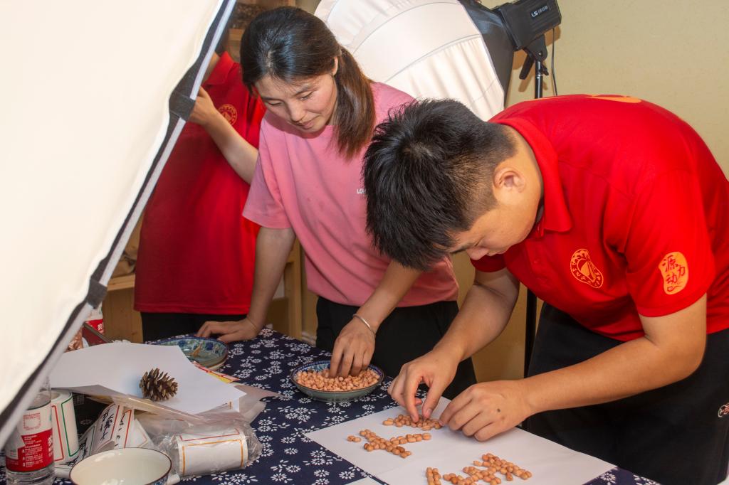 在村支书侯红艳和项目对接负责人吴瑛的指导下,队员们分头行动,每人负责一种农产品,结合其特点构思拍摄方案并进行拍摄。盐菜的独特风味、石耳的珍稀特质、干香菇的菌褶纹理、花生的圆润饱满……队员们用相机、打光灯、乡土道具,将每种农产品的核心卖点转化为生动的视觉语言。这些饱含巧思的宣传图将成为山货的“名片”,带领农产品走向更广阔的市场。