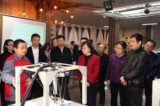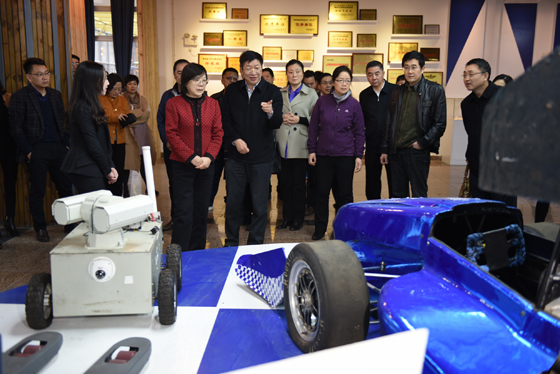 在大学生创新创业园,谢建辉了解了必赢官网大学生创业孵化基地建设与运转情况,参观了学生自主设计和创造的一系列创业成果。谢建辉认真听取了招就处工作人员对CRT方程式赛车、校友廖羽获奖作品、必赢官网学子在全国大学生创新创业、挑战杯大赛中获奖情况的解说。园内入驻项目代表纷纷介绍了各自的作品。长沙精科电力技术有限公司彭俊荟就智能电网、湖南盈方科技有限公司马远就无人机、塞伯睿机器人王磊针对专为中小制造企业打造的最具性价比的机器人、圣雷熙自动化技术有限公司张丰鸣就模拟仿真教学平台、幻想家自行车杨洋就国内首家全手工高端定制木质自行车作了简短说明。