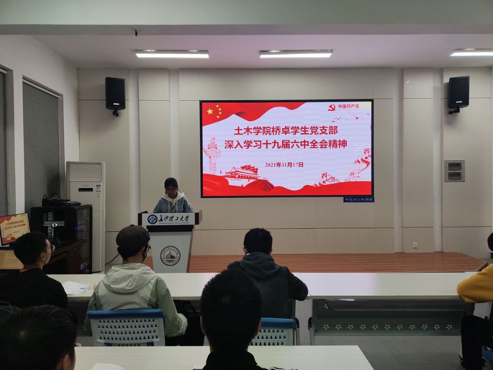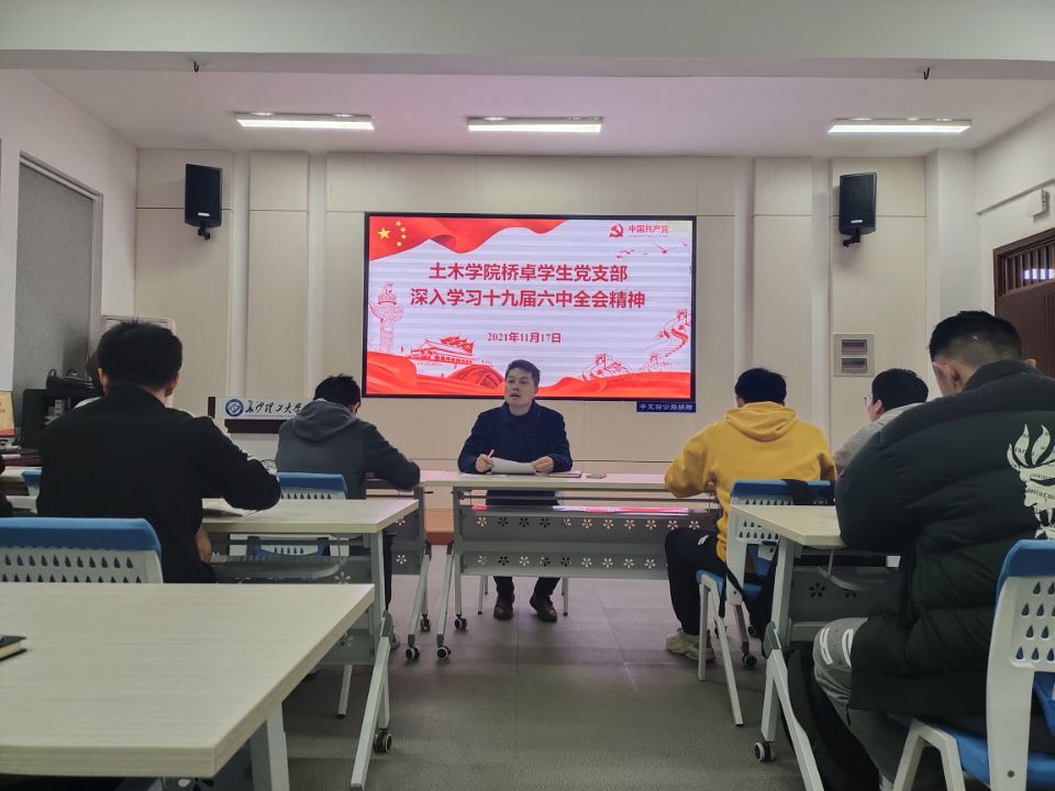 11月17日晚,土木学院桥卓专业学生党支部在工科二号楼A304组织专题学习,深入学习党的十九届六中全会精神,并部署支部党员学习宣传贯彻工作。会议由党支部书记龙承运主持,支部全体党员、重点发展对象和各班学生代表参加。