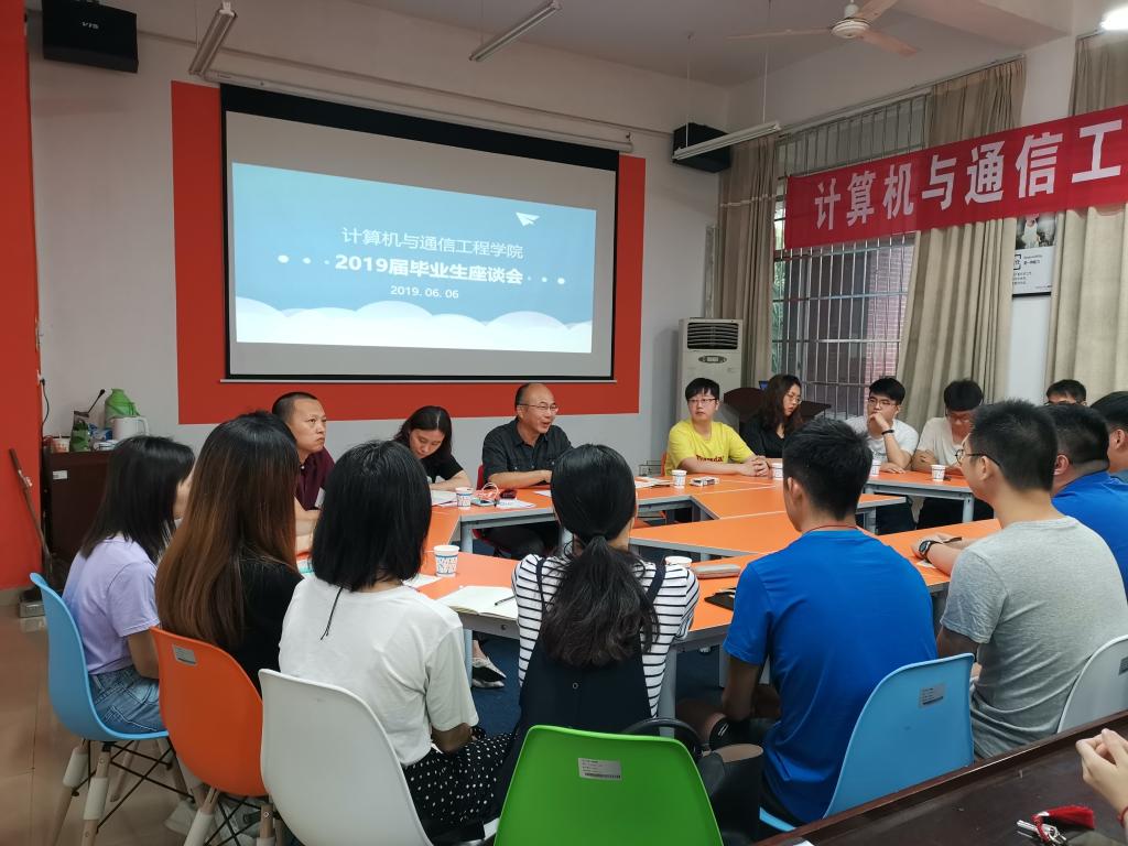 6月6日下午,计通学院在理科楼B103召开2019届毕业生座谈会。学院党委书记甘为、副院长王威、副书记陈华参加,学工办辅导员潘枝花主持。2019届本科生、研究生共计20名毕业生代表参加。