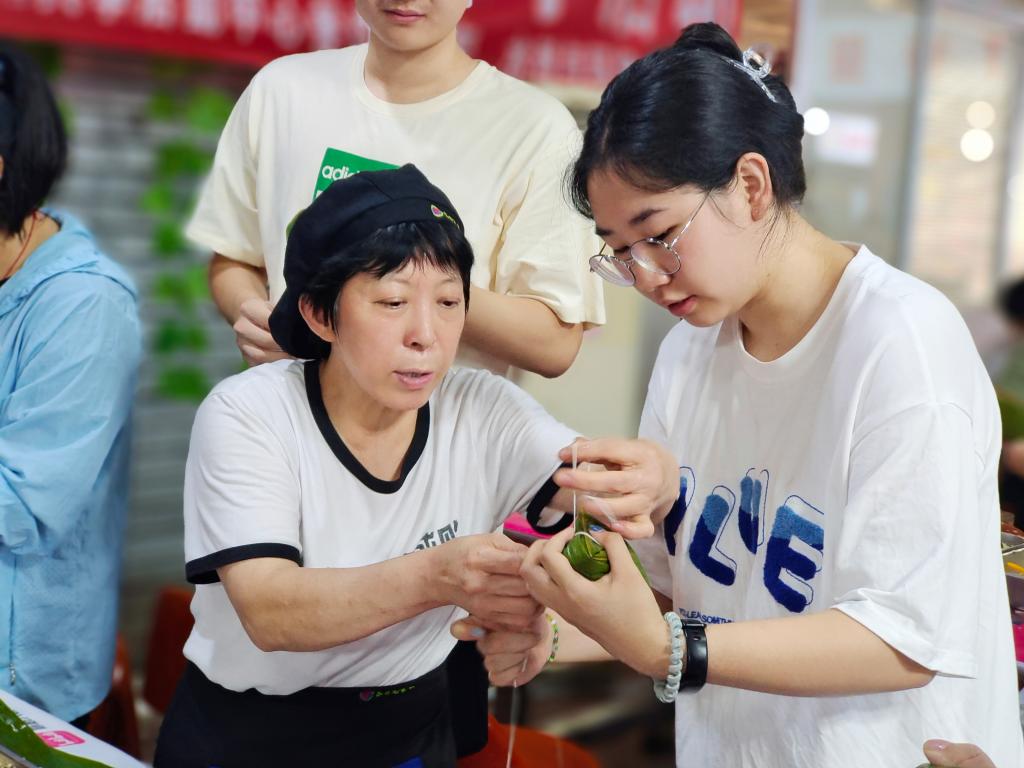 “压紧压实糯米后,将粽叶折下来,捋成一个三角形”“绑线时,找好角度多缠绕几遍,不然糯米会流出来”……学校餐饮服务的师傅们化身指导老师,现身说法,手把手教同学们包粽子。