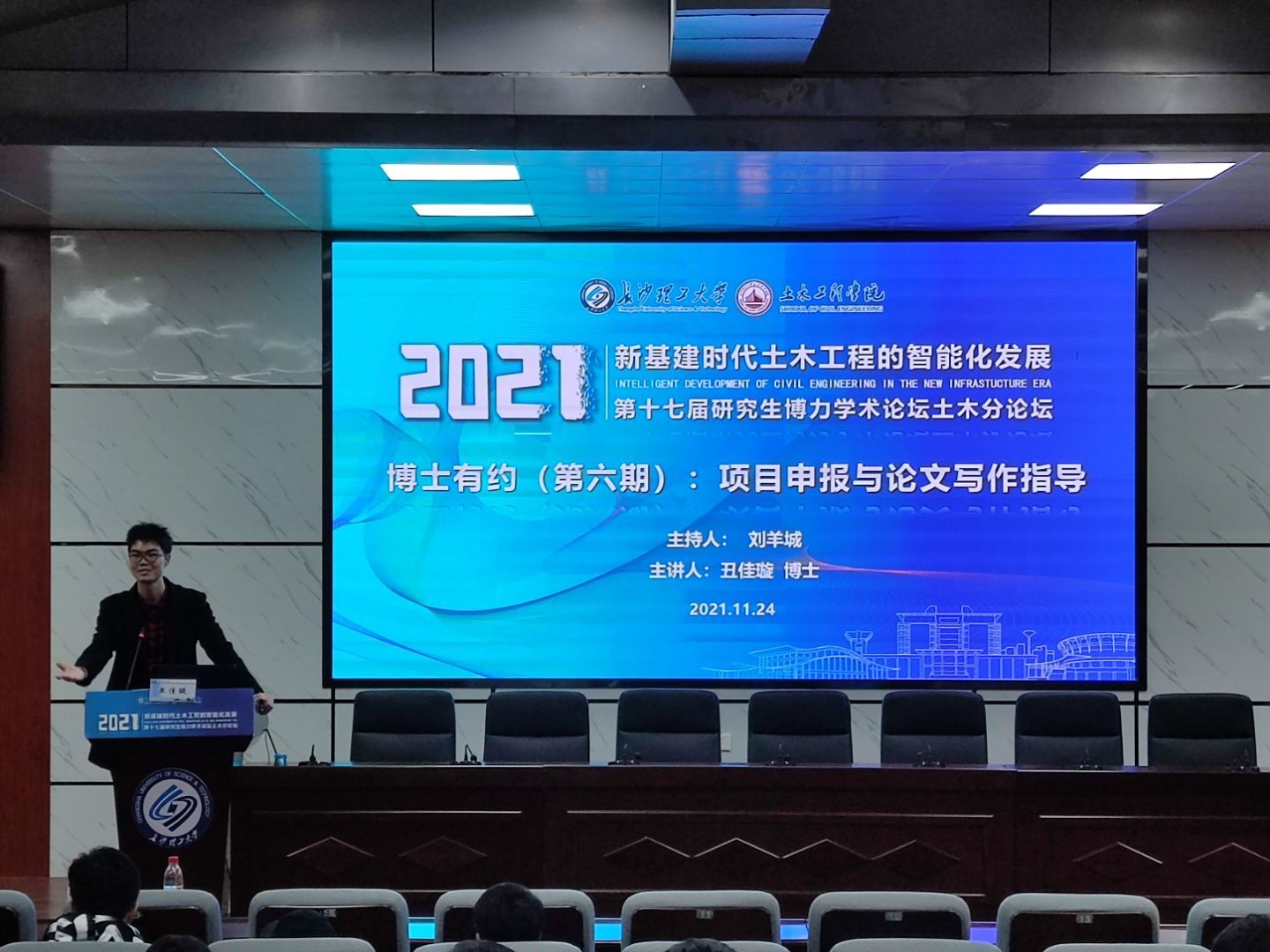11月24日,土木工程学院博力学术论坛系列活动之“博士有约”(第六期)学术沙龙在金盆岭校区四教学术报告厅举行。学院博士研究生丑佳璇应邀主讲,学工办助管赵爱华及200余名硕士研究生参加活动,院研会副主席刘羊城主持会议。