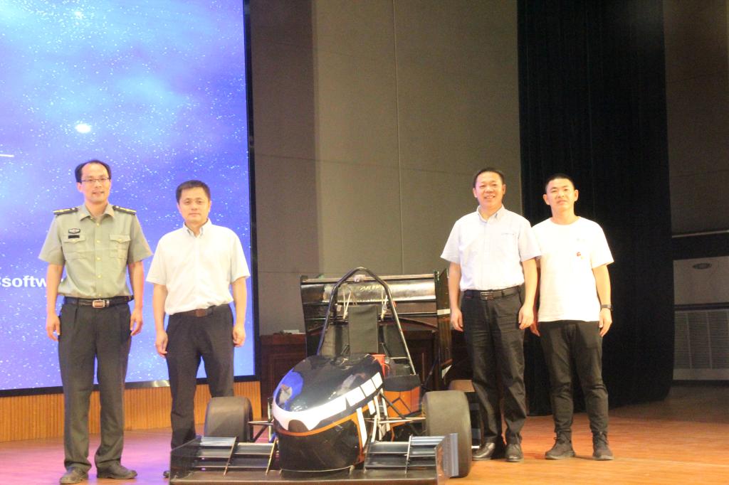 宣誓完毕,一段振奋人心的宣传片揭开CRT方程式赛车队新车FNX-21E的面纱,CRT车队队长介绍了车队,学院党委书记施一满、院长杜荣华、副书记唐宏宾、车队指导老师伍文广和车队负责人一同为本赛季新车揭幕。