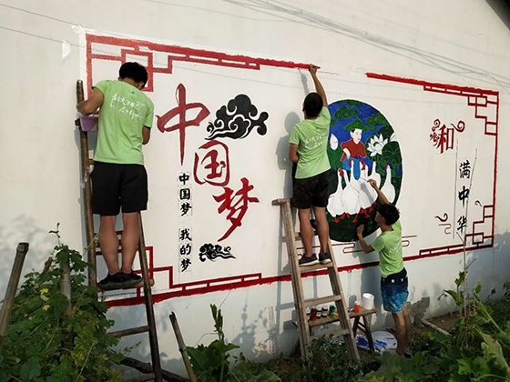 昨天的一场大雨洗净尘埃,天气却也是愈发的好了,早晨七点钟的太阳便已让大家大汗淋漓,照在白墙上晃得大家睁不开眼,但这一切并不是问题,大家克服一切困难,于724日圆满完成两面墙的墙绘。