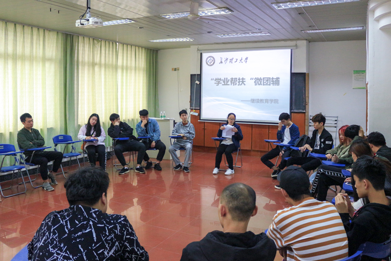 426日中午继续教育学院主任辅导员刘卓明在学院团体辅导室,组织上学期德育分重修的26名同学,开展了学业帮扶微团辅活动。
