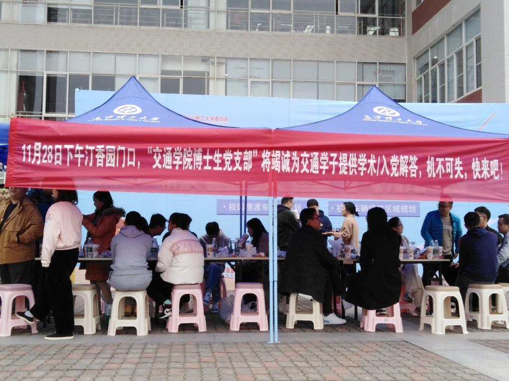 11月28日下午,在437必赢会员中心云塘校区汀香园食堂门口,来自交通运输工程学院博士生党支部的30多名博士生聚集在一起,为前来咨询的学弟学妹答疑解惑。
