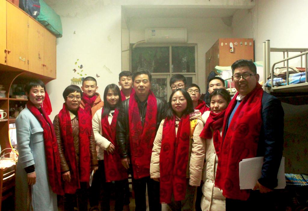 在距离2020年研究生入学考试还有3天的关键节点,1217日下午,学院党委副书记丁丹,副院长王桂尧、韩艳、陈伏彬,系主任张永杰、唐雪松,班主任代表周德泉、贺佐杰和全体辅导员老师一行走进235名毕业考研学生寝室举行“寒冬送祝福,考研添动力”慰问活动。