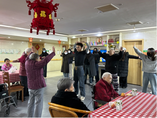 随后,同学们分组开展丰富多彩的志愿活动。表演组率先登场,带全体老人练习八段锦舒缓的音乐声中,同学们动作规范富有活力,老人们也认真地跟着比划。一位参与活动的爷爷感慨道:“能和孩子们一起锻炼,感觉浑身都有劲儿!”在同学们的带动下,老人们不仅身体得到了锻炼,精气神也愈发饱满。